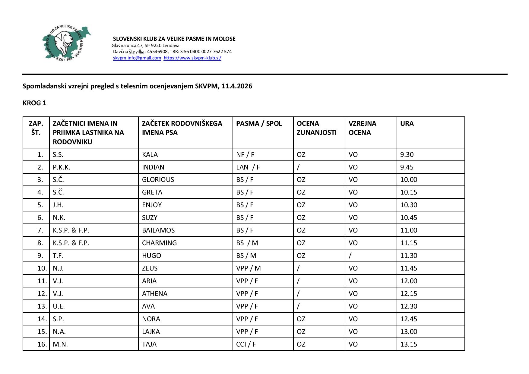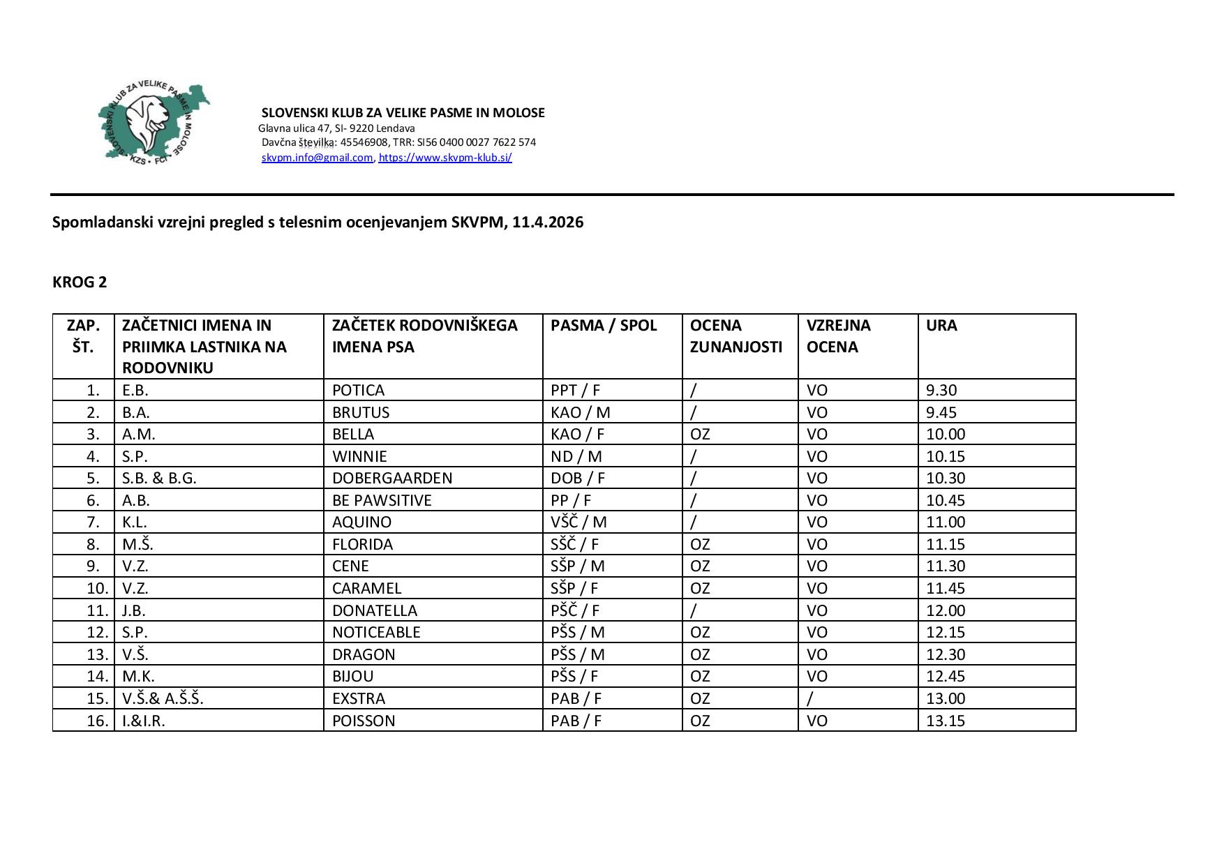 prijave za spomladanski vzrejni pregled (VP) z oceno zunanjosti (OZ) kluba SKVPM so zaključene. Objavljamo urnik razpored pasem po krogih: