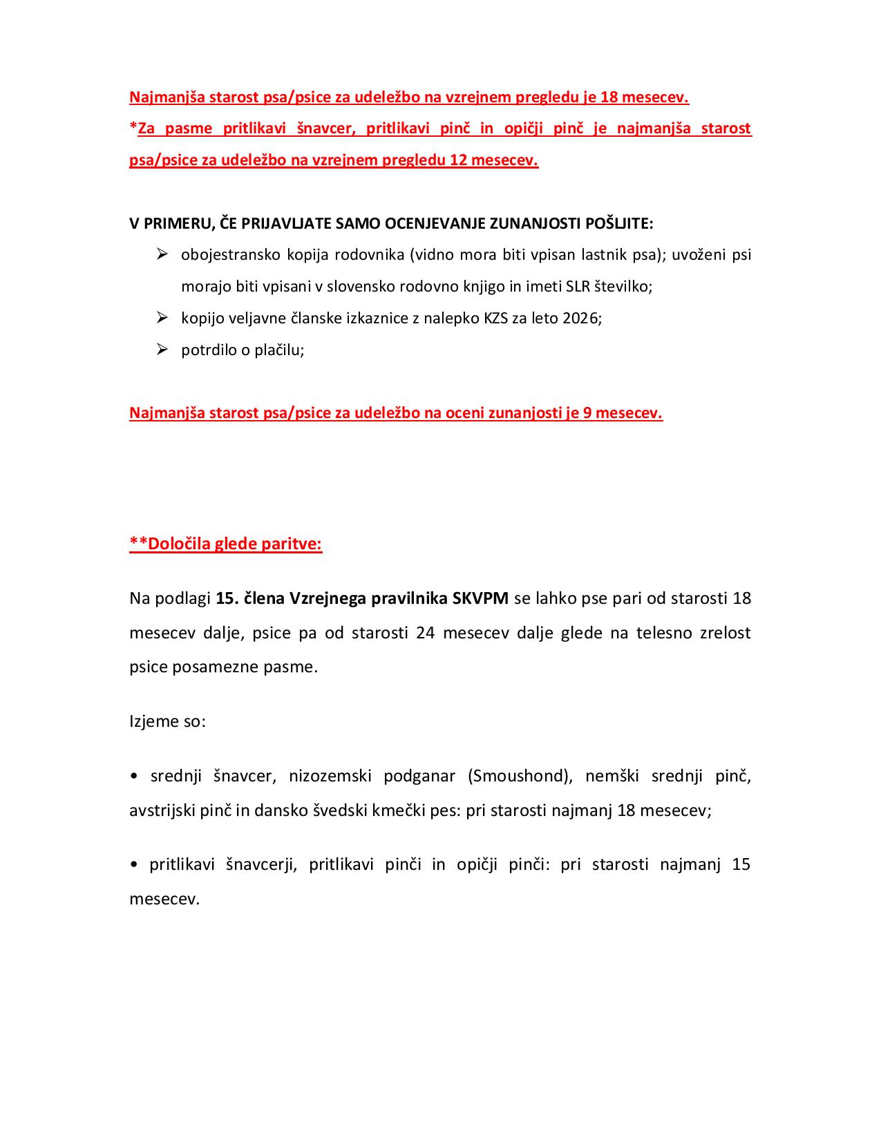 * Za pasme pritlikavi šnavcer, pritlikavi pinč in opičji pinč je najmanjša starost psa/psice za udeležbo na vzrejnem pregledu 12 mesecev.