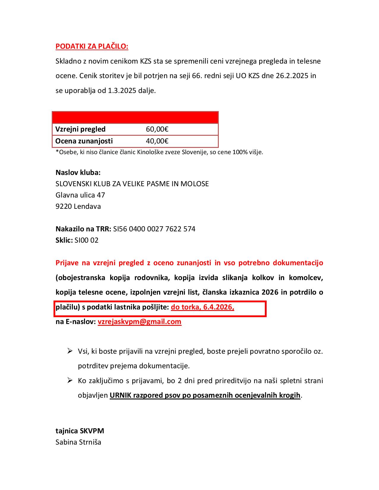 dodatne informacije za vzrejne preglede